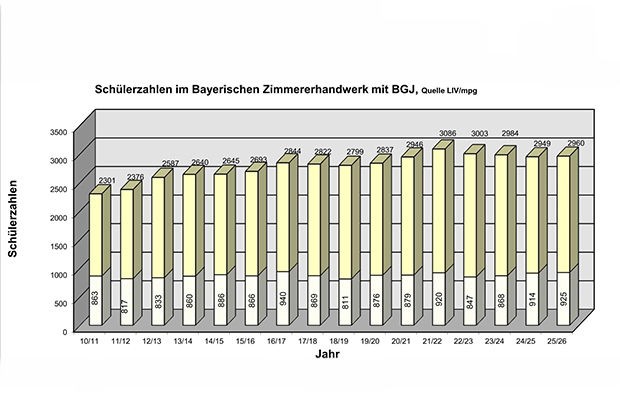 Eine Ausbildung im Zimmererhandwerk ist für junge Menschen nach wie vor attraktiv. Seit dem Schuljahr 2020/21 können wir in Bayern immer über 2900 Lehrverhältnisse registrieren. In diesem Jahr meldeten uns die sieben Bayerischen Regierungsbezirke insgesamt 2960 Schülerinnen und Schüler.
